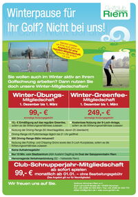 Nach der Golf(Sommer)-Saison ist die vor der Golf(Winter)-Saison. Wir bieten allen Golfern, die über den Winter aktiv bleiben möchten unsere Winter- Mitgliedschaften an. Wer Üben möchte, zahlt ab 1. Dezember bis 01. März € 99,- und bekommt € 10,- Ermäßigung auf Greenfee.