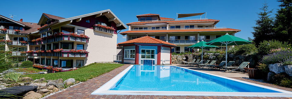 ... mitten im Grünen, umgeben von Allgäuer Bergwelt, finden Sie unser Hotel. Eine große Gartenanlage mit Sonneninseln und Liegestühlen und der Golfplatz Oberstaufen (18-Loch + 9-Loch-Kurzplatz) direkt vor der Haustüre erwarten Sie.