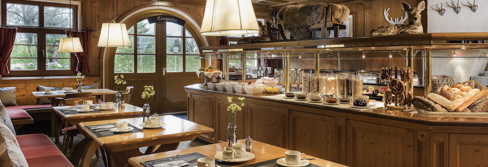 Gastronomie: Im Alt Partenkirchen Restaurant des Hotels können Sie beliebte bayerische Speisen aber auch internationale Gerichte genießen. Der Biergarten bietet einen atemberaubenden Blick auf die umliegenden Berge.